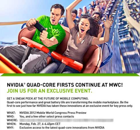 NVIDIA je jučer poslala svoje pozivnice koje potvrđuju barem jednu od glasina i prognoza – pametne telefone i tablete s četverojezgrenim procesorima. Iako NVIDIA nije jedina koja će ponuditi quad core procesore u mobilnim uređajima na ovaj načine žele biti prvi koji će to učiniti. Svi znamo da prvi ne znači uvijek i najbolji.