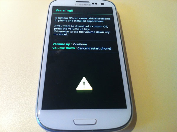 8. Pokrenite GS3 u Download mode – istovremeno pritisnite i držite POWER+VOL DOWN HOME; Pojavit će se tekst sa žutim trokutom pa potvrdite s VOL UP