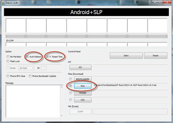 5. U Odinu stavite kvačicu ispred PDA i potom kliknite na PDA gumb i pronađite CF-Root-SGS3-v6.4.tar