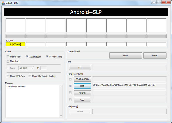 9. Spojite GS3 s računalom i pričekajte dok Odin ne prikaže žuto polje (to znači da je uređaj prepoznat i možete dalje)