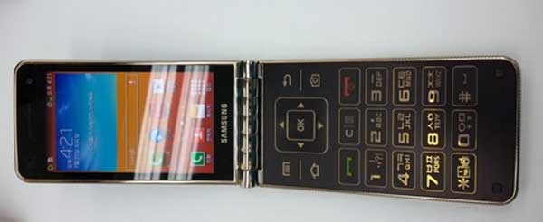 Samsung Galaxy Golden, oznake SHV-400EK, a poznat i kao Galaxy Folder ima dva 3.75” AMOLED zaslona rezolucije 480 x 800. Pokreće ga, slušajte sad ovo, quad-core 1.7 GHz Qualcomm Snapdragon 400 procesor s 2 GB RAM-a 🙂 Ne zna se još koliko interne memorije ima, no zna se da vrti Jelly Bean 4.1.2, ima dvije kamere, bateriju kapaciteta 1820 mAh, FM radio i podršku za LTE.