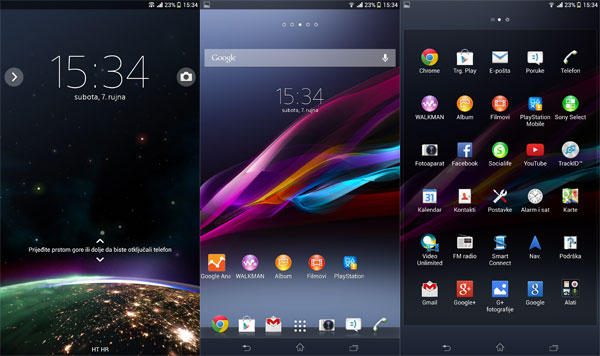 Xperia Z Ultra dolazi s Androidom 4.2.2. Zaključani nam je zaslon već poznat i ima onaj efekt rolete pri otključavanju. S njega možete direktno pokrenuti kameru ili možete dodati bilo koji widget po izboru.. Početni zaslon pruža pozamašne mogućnosti prilagodbe kroz 8 različitih tema, s pripadajućim pozadinskim slikama. Sveukupno 7 stranica početnog zaslona uređujete prečacima, widgetima i mapama.