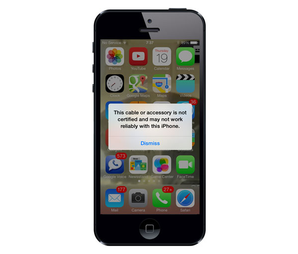 Već je kroz bete iOS-a 7 bilo razvidno da Apple želi odlučno napasti proizvođače ali i korisnike neautoriziranih jeftinih Lightning kablova koje mnogi pa i Apple krive za tragične slučajeve električnih udara iz raznih kutova svijeta. Naime, svaki put kada bi iuređaj s iOS-om 7 detektrirao Lightning kabel, kojeg Apple nije autorizirao, na zaslonu bi se pojavila naporno upozorenje kako kabel nije orginalan i kako možda neće raditi kako treba. Upozorenje se međutim lako moglo odbaciti i pristupiti punjenju baterije.