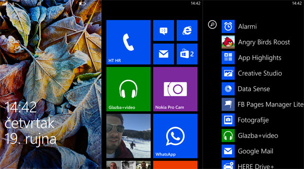Inače je vizualno sve manje više isto. Uređaj se otključava guranjem zaključanog zaslona prema gore. To vas dovodi na početni zaslon, koji je sačinjen od živih pločica u tri veličine, koje predstavljaju aplikacije i widgete. Guranjem početnog zaslona ulijevo otvara se abecedni popis svih instaliranih aplikacija koje je opet po želji moguće prikačiti na početni zaslon. U pravilu sve već debelo poznato s drugih WP 8 modela. Tu je i Dječji kutak koji zapravo otvara dodatni korisnički profil namijenjen djeci ili bilo kome drugome koga se u kući bojite da će vam pobrisati podatke ili šefu napisati opsceni mail.