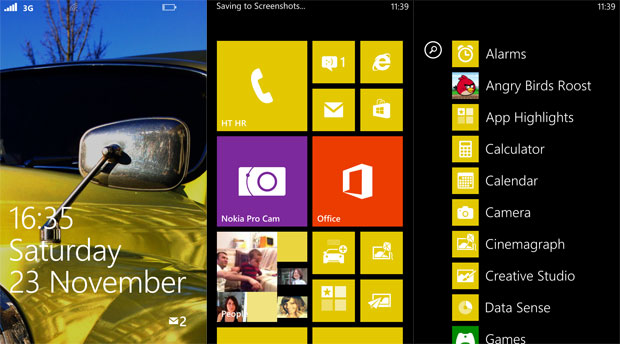 Uređaj se otključava guranjem zaključanog zaslona prema gore. To vas dovodi na početni zaslon, koji se temlji a prikazu živih pločica u tri veličine, koje predstavljaju aplikacije i widgete. Guranjem početnog zaslona ulijevo otvara se abecedni popis svih instaliranih aplikacija koje je opet po želji moguće prikačiti na početni zaslon.