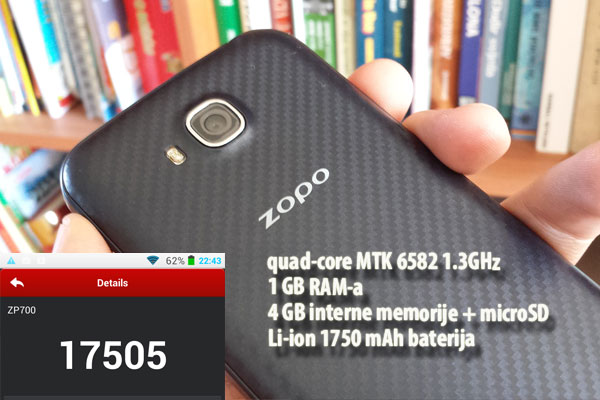 Zopo ZP700 je pokretan Mediatekovim čipom oznake MTK6582 s četiri jezgre takta 1.3 GHz, 1 GB RAM-a i Mali-400 MP grafičkim procesorom. Unutra je i 4 GB interne memorije od čega je dostupno oko 2.5 GB na dvije particije. Proširiti to možete microSD karticama. Plus je i podrška za USB OTG priključivanje USB memorijskih stickova uz odgovarajući adapter. Sve to skupa pruža solidne performanse što se očituje u brzom surfanju internetom, glatkoj reprodukciji multimedije i igricama.