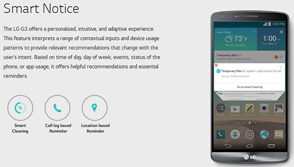 LG poručuje kako G3 ne samo da je impresivan u dizajnerskom smislu već u svojem portfelju aduta ima i niz Smart značajki kojima će upotpuniti i poboljšati korisničko iskustvo onih koji si ga priušte. Jedna od zanimljivijih značajki je nešto što u LG-u zovu Smart Notice, a zapravo je servis koji na početnom zaslonu, korisnika obavješćuje, podsjeća i upozorava predviđajući koje su to informacije najpotrebnije u datom trenutku.