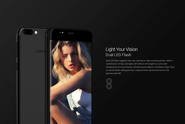 Uz dva oka makere na leđima LEAGOO M7 ima i dual LED bljeskalicu kako snimio odlične fotografije i u uvjetima slabijeg osvjetljenja. Kombinacijom dvaju LED bljeskalica, M7 detektira razinu ambijentalnog osvjetljenja i temperaturu boja te prilagođava bljeskalicu kako bi snimio prirodne fotografije.