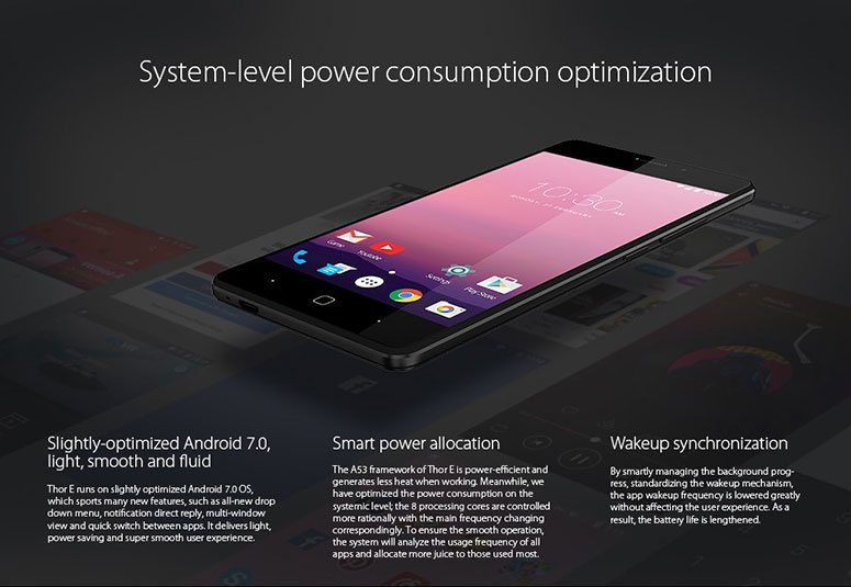 Kako bi osigurao dugotrajnu autonomiju Vernee je za Thor E odabrao energetski učinkoviti osmojezgreni čip s Cortex A53 jezgrama i 3 GB RAM-a.