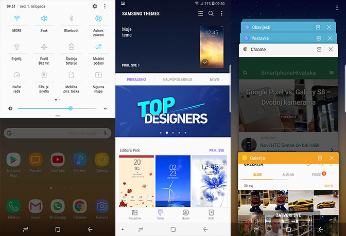 Ispod doka je sada navigacijska traka s tipkama Natrag, Home i Multitasking, a možete mijenjati njihov redoslijed i boju pozadine. Multitasking prikaz prikazuje nedavno korištene aplikacije, omogućuje podjelu zaslona i rad u dvije aplikacije istovremeno, a Samsung je omogućio i onaj svoj skočni prozor s aplikacijom u prozorčiću.