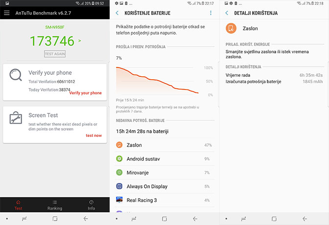 Display Mate, renomirani portal za ocjenu ekrana, zaslon Notea 8 proglasiše najboljim smartphone zaslonom na tržištu. Ne palim se na takve ocjene, no svakako je riječ o izvrsnu zaslonu. Mrvicu veći i mrvicu manje zaobljen, zaslon Note 8 macana je i nešto malo svjetliji od izuzetno svijetlog zaslona Galaxya S8+.