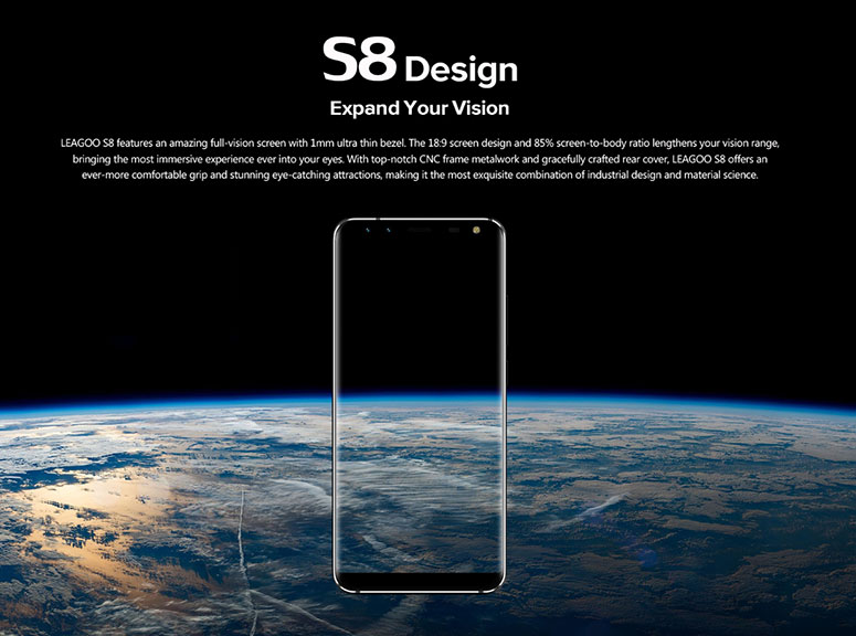 LEAGOO S8 ima izvrstan full-vision zaslon s ultra tanjim okvirom debljine 1 mm. 18:9 format zaslona i 85% prednjice prekrivene ekranom proširuje vaš vidik i tako osigurava uranjajuće iskustvo gledanja.