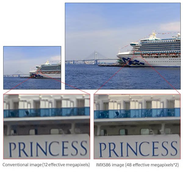 IMX586 senzor ima piksela veličine 0.8 mikrona, a senzor je veličine 8 mm u dijagonali pa je Sony primijenio tehnologiju sabijanja informacija s 4 susjedna piksela u jedan i tako efektivno daje 12MP fotografije ekvivalentne senzoru s 1.6 mikrona kim pikselima.