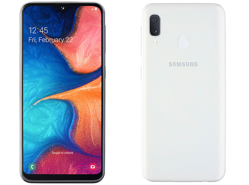 Galaxy A20e ima 5,8-inčni Infinity-U LCD zaslon HD+ rezolcije s 8MP selfie kamerom u V zubiću na vrhu. Pokreće ga Exynos 7884 s 3GB RAM-a i 32GB podatkovnog prostora proširivog microSD karticama. Opremljen je baterijom kapaciteta 3.000 mAh, a podržava 15W brzo punjenje. Na leđiam uz kapacitivni čitač otiaka ima i 13MP f/1.9 kameru.