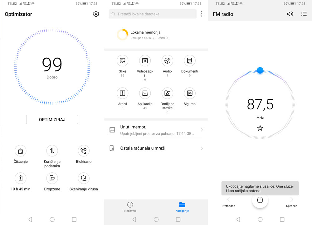 Standardne Googleove aplikacije, Hauwei je nadopunio svojima pa ćete tu još pronaći Datoteke, Phone Clone, FM radio, Zdravlje i slične. Optimizator je onaj alat kojim ćete jednim klikom malo pročistiti RAM i sve ono što će uređaj s vremenom učiniti tromim u radu.