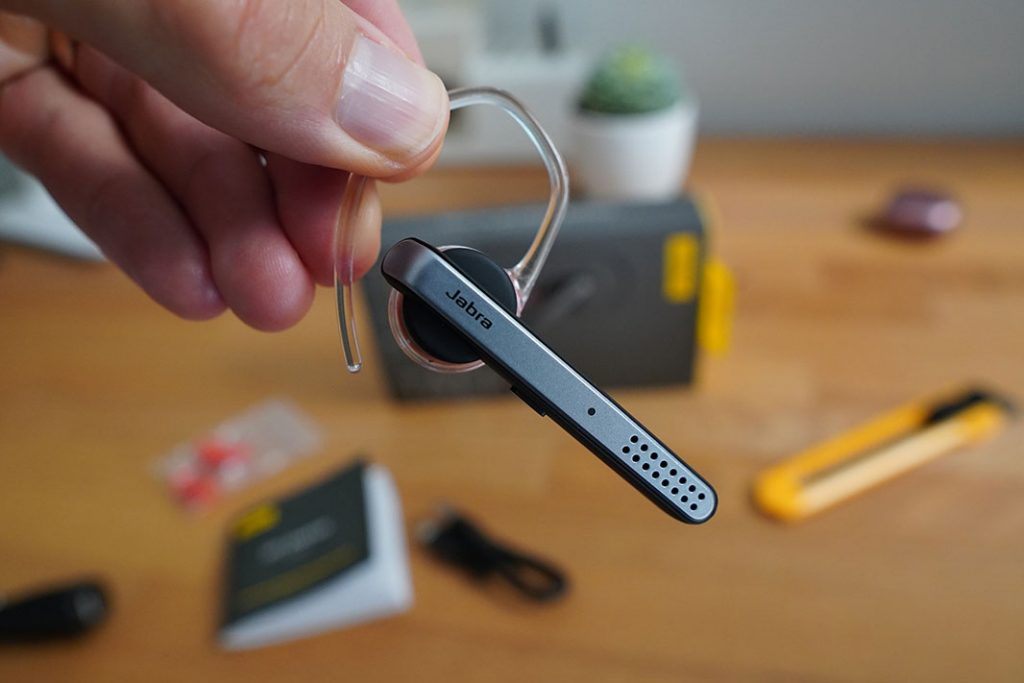 Slušalica ima relativno dugi vrat koji mikrofon spušta do usta, a drugi mikrofon nalazi se nešto više. Pri vrhu je Jabra logotip, kojeg možete pritisnuti. Taj fizički gumb jasno klika pod prstom, a njime ćete primiti ili završiti poziv ili pak pauzirati ili pokrenuti reprodukciju glazbe, videa ili podcasta. Da, Jabra Talk 45 će poslužiti i za takve namjene.