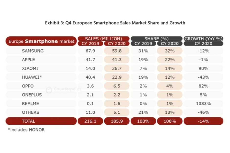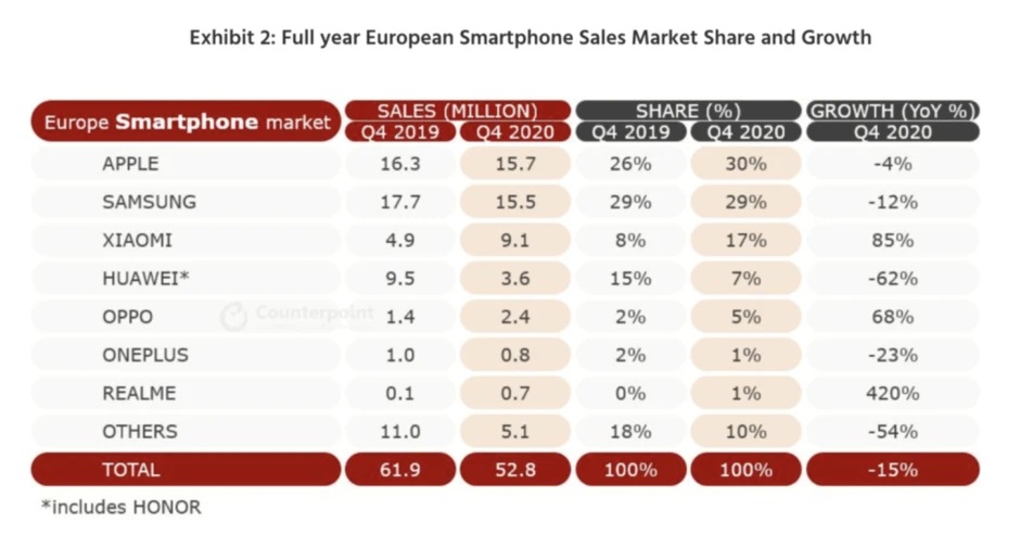 Tvrtka za istraživanje tržišta Counterpoint, objavila je analizu europskog tržišta pametnih telefona prošle godine. Iz nje iščitavamo da su Samsung i Apple unatoč padu prodaje zauzeli vodeće pozicije, no nisu oni ti koji su se nahranili Huaweievim dijelom kolača.