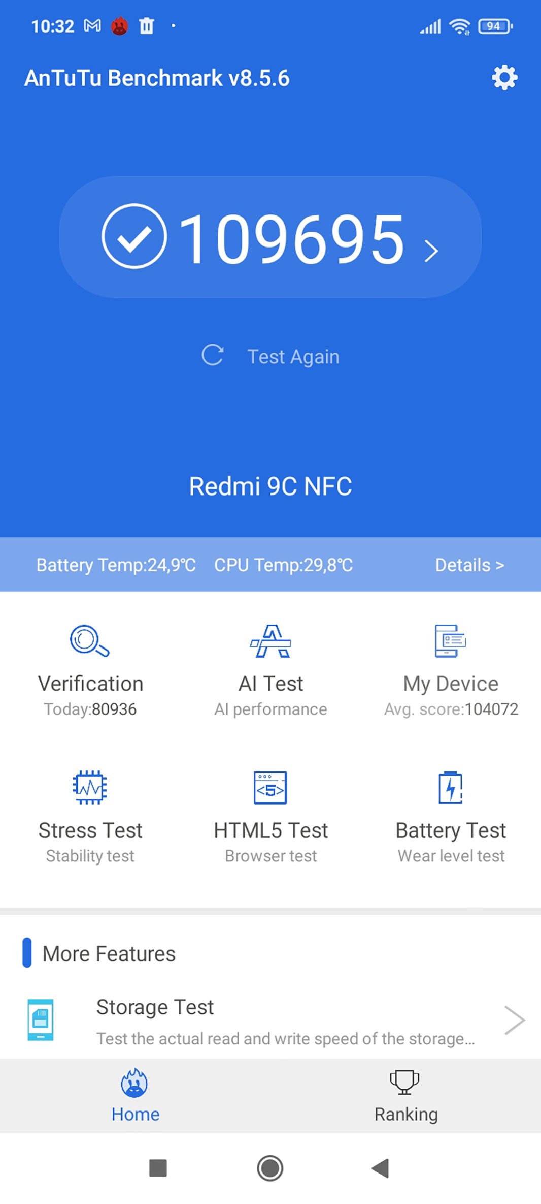 Redmi 9C NFC pokreće 12nm MediaTek Helio G35 čip s osam jezgri i 2 odnosno 3GB RAM-a i 32 odnosno 64GB podatkovne memorije proširive microSD karticama. Moj testni je ovaj “jači” s 3/64GB memorije i performansama je po mojem sudu u potpunosti zadovoljio.