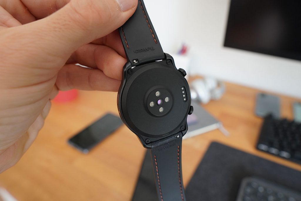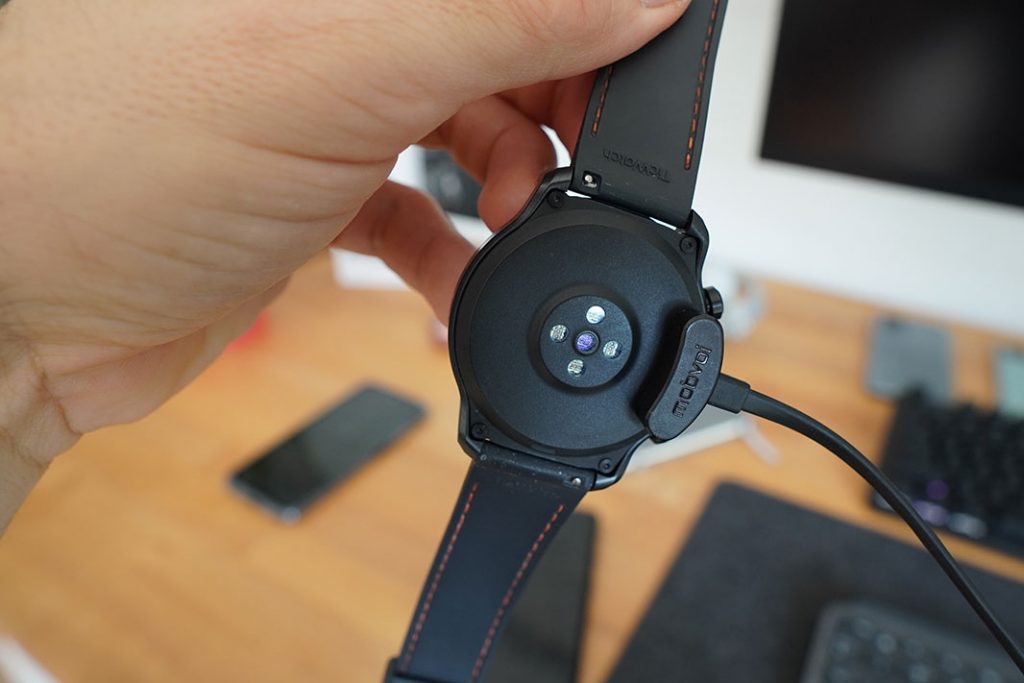S donje strane su senzori otkucaja srca i oksigenacije te PIN konektori za punjenje. Naime, Ticwatch Pro 3 ne podržava bežično punjenje, već se puni kabelom s PIN-ovima i magnetom se sigurno lijepi za sat. Drugi kraj tog dovoljno dugog plosnatog kabela koji se ne petlja ubodete u bilo koji punjač od mobitela ili USB port na računalu. Punjenje potpuno ispražnjenog sata traje nešto dulje od sat vremena.