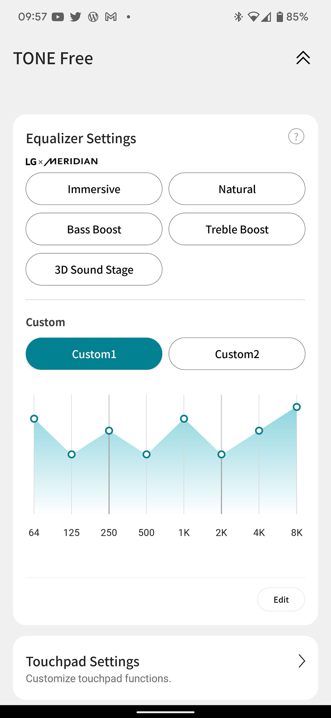 Tu ćete aplikaciju koristiti i za detaljan pregled kapaciteta baterije slušalica i kutijice ali i birati između nekoliko preddefiniranih profila zvuka. Uz Immersive, Natural, Bass Boost, Treble Boost i 3D Sound Stage možete se poigrati ekvilajzerima i kreirati do dva vlastita profila. Onaj zadani profil zvuka osobno me nije oduševio, a od preddefiniranih najviše mi je odgovarao Treble Boost.