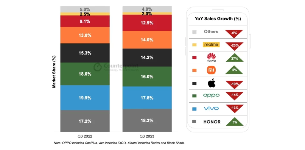 Najveći rast u Kini na godišnjoj razini ipak bilježi Huawei. Oni su zahvaljujući novom Mate 60 Pro flagshipu u Q3 ove godine pojačali prodaju za čak 37%. Zaprijetili su tako Xiaomiu, kojemu s 12.9% tržišnog udjela sad već dobro pušu za vrat.