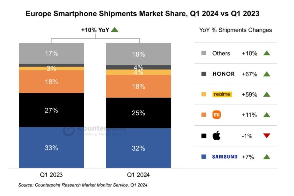Europsko pametnih telefona u prvom kvartalu ove godine prema istraživanju tvrtke Counterpoint, bilo je poprilično zanimljivo. Prije svega vidimo znakove ozdravljenja tržišta, na koje ukazuje i 10-postotni rast prodaje telefona u odnosu na isti kvartal lani.