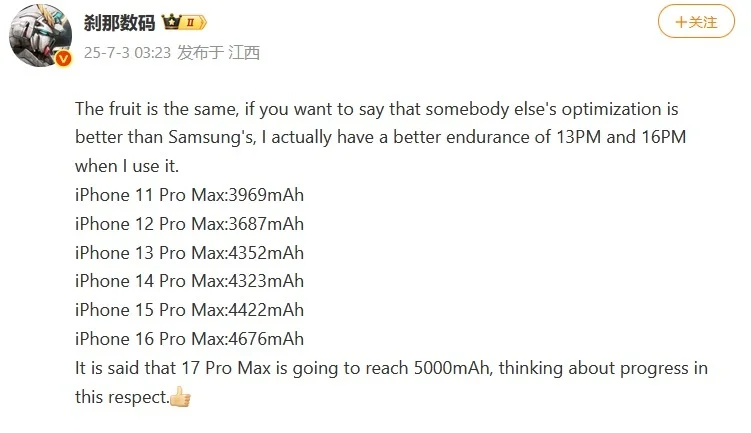 Sve one koji će radije odabrati masivniji uređaj s jačom baterijom zanimat će iPhone 17 Pro Max, koji će prema najnovijoj objavi na kineskoj mreži Weibo dobiti 7% jaču bateriju od svojeg prethodnika.