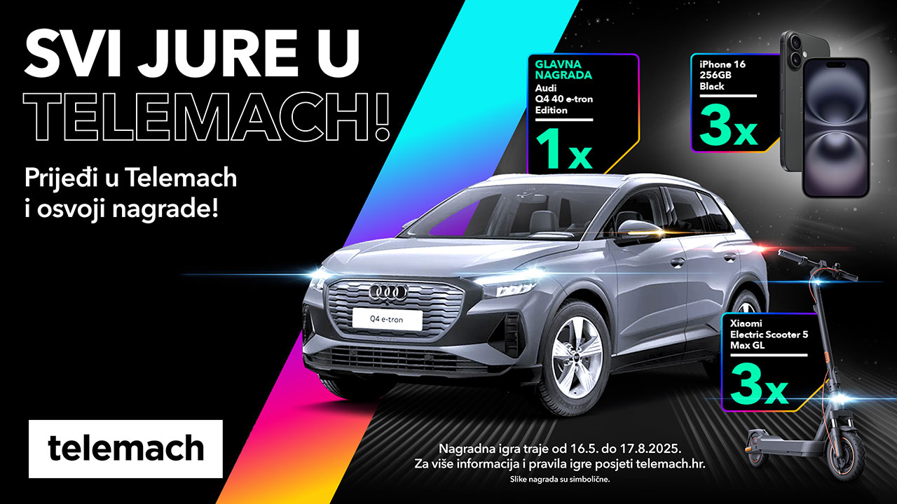 Naime, u tijeku je zadnji krug velike nagradne igre u kojoj novi korisnici Telemacha mogu osvojiti vrijedne nagrade: Apple iPhone 16, Xiaomi električni romobil te glavnu nagradu – električni Audi Q4 40 e-tron Edition, premium vozilo koje spaja snagu, stil i održivost.