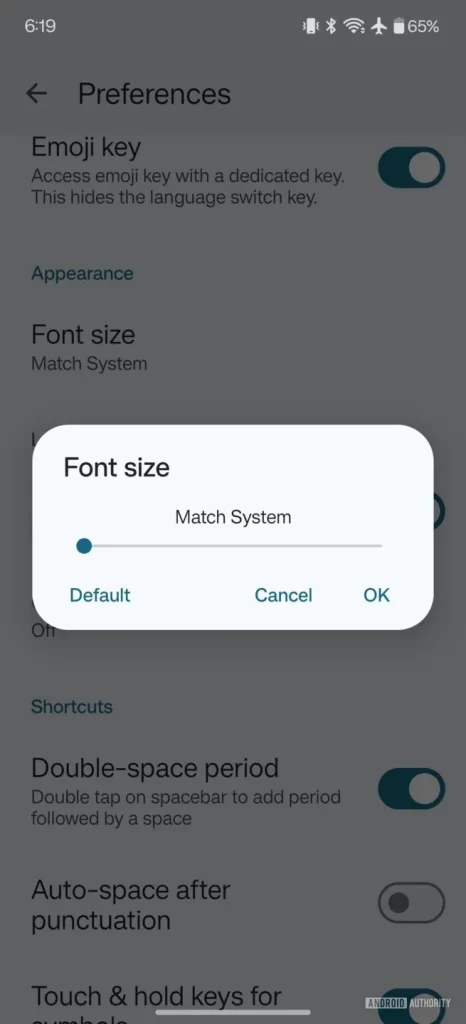 Opcija se nalazi u Gboard postavkama pod Preferences > Font Size, gdje se pomoću klizača može odabrati željena veličina. Trenutno klizač podržava samo unaprijed definirane vrijednosti, a ne fino podešavanje.
